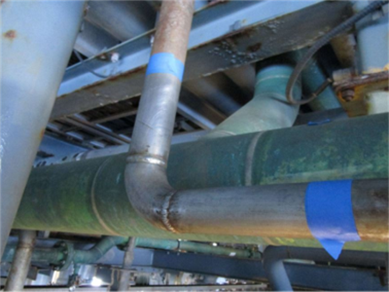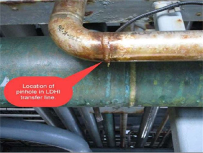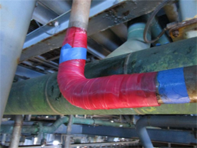 Problem: 海上平台上的LDHI(低剂量天然气水合物抑制剂)运输管弯头的焊缝,因外部腐蚀出现一个针孔泄漏,管径2”,工作温度100°F,设计压力150psi。客户需要一个快速解决方案,能够堵漏并且维持正常运转。
