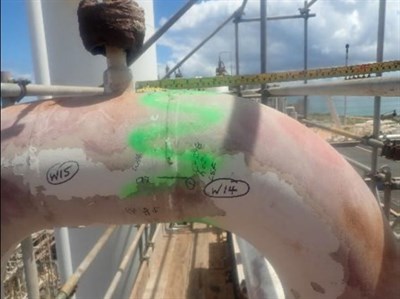 施工严格按照贝尔佐纳施工技术指导VPF-11进行。先对基材表面进行喷砂处理,达到SA 2.5级,75微米粗糙度。按照标准设计,Belzona SuperWrap II包扎8层,包扎长度490mm,使用Belzona1983树脂,修复设计寿命12年。