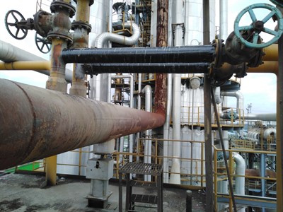 Problem: 炼油一部催化安全阀附属管线发生腐蚀减薄,影响装置的安全运行。为了保证装置的安全运行和人员生命财产安全,采用贝尔佐纳复合材料包扎增强的方式对管线减薄部位进行修复补强。
