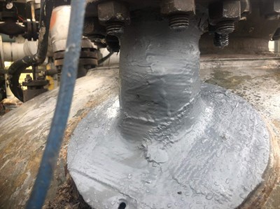 Application was carried out in accordance with Belzona Know-How System Leaflet VPF-11. The repair area was prepared using spark free vapor blast and tools to clean and roughen the substrate to a near white SSPC SP10 finish. The repair was done in-situ while the vessel was still in operation. Belzona 1511 was used to build up around the hose clamp to achieve a smooth surface for final repair. Belzona 1392 with a reinforcing cloth was then used to wrap the entire nozzle and onto the vessel body with a final coat of 1392 over the entire repair.