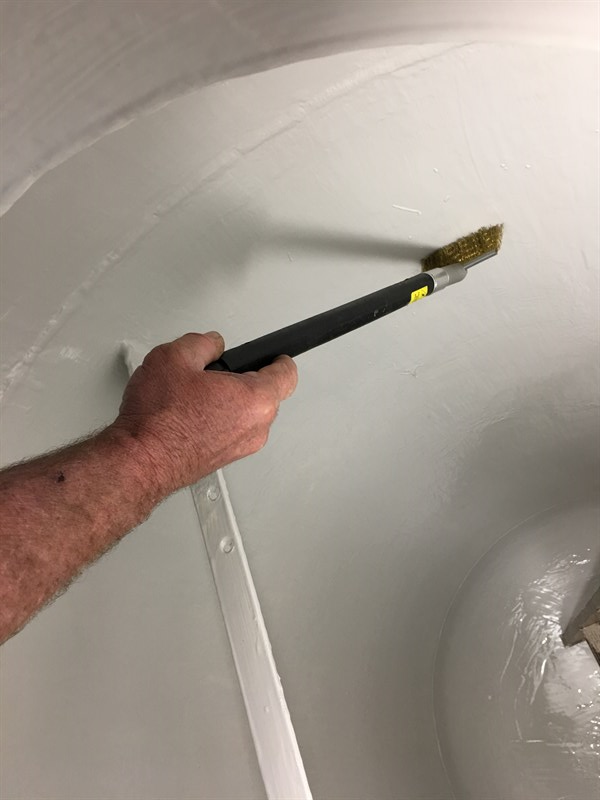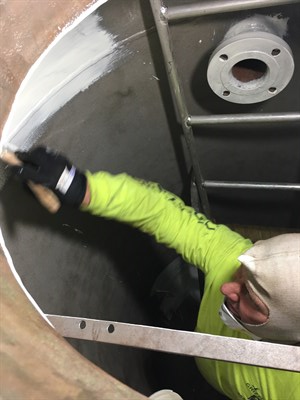 These tanks were blasted by Sponge Jet method to control dust in this closed environment. Two coats of Belzona 1381 were applied by brush. The product cured overnight and then was spark tested to detect any holidays. The application was done in accordance with Belzona System Leaflet TCC-5.