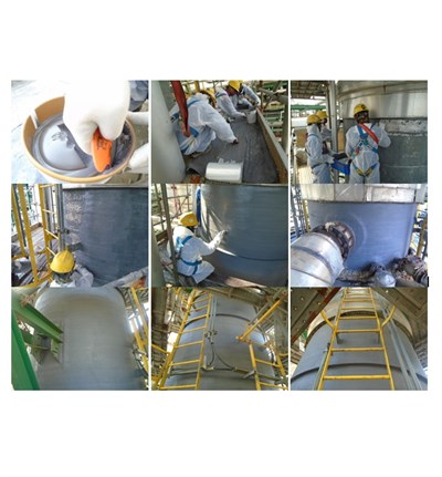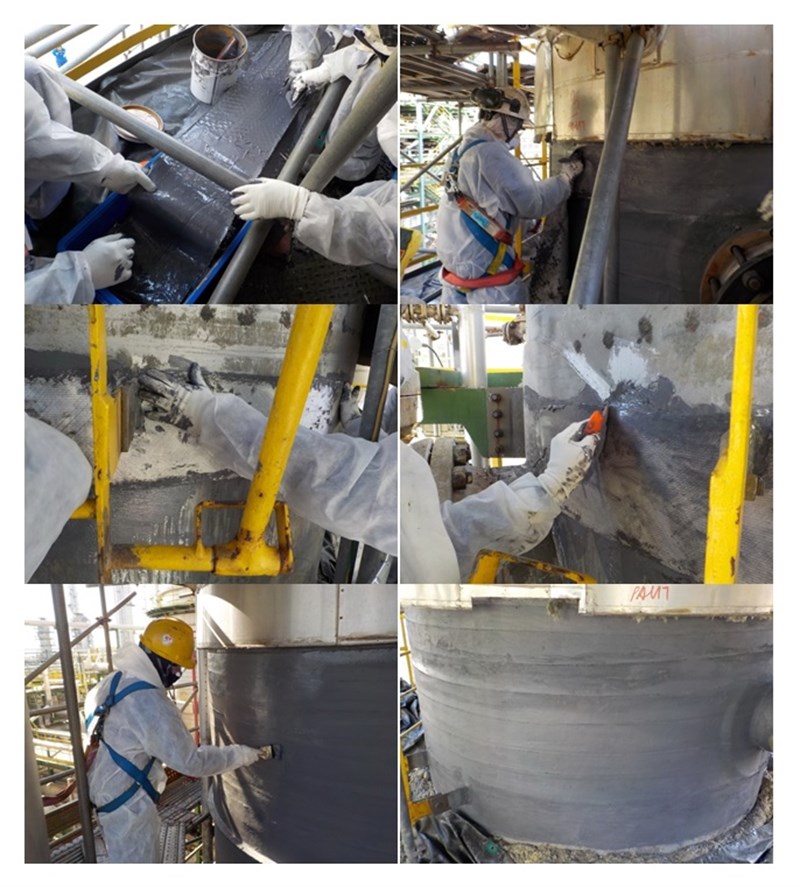 Due to the fact that we have to work on hot surface all the time, surface preparation by flap disc and pneumatic rotary grinding machine were allowed to use to remove all existing silicone base paint and most of inorganic ethyl zinc silicate. After that we used Belzona 1251 to smooth out weld seams and rim of nozzle reinforcement pads. Finally we applied two wraps (four layers) of Belzona 5851 together with Belzona 9371 around the target area Total application area 31 sq.m.