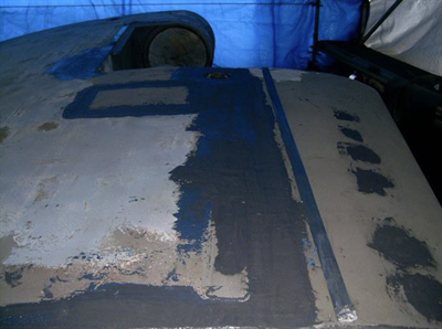 1. View of one of the many badly cavitated areas on the two rudders 2. Rebuilding of eroded areas in progress 3. Application of 1st coat of Belzona 1341 in progress 4. Application of 2nd coat of Belzona 1341 completed