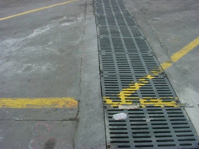 Drainage channel at entrance to bus depot. "Speed hump" also required to control traffic entering depot