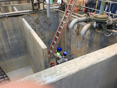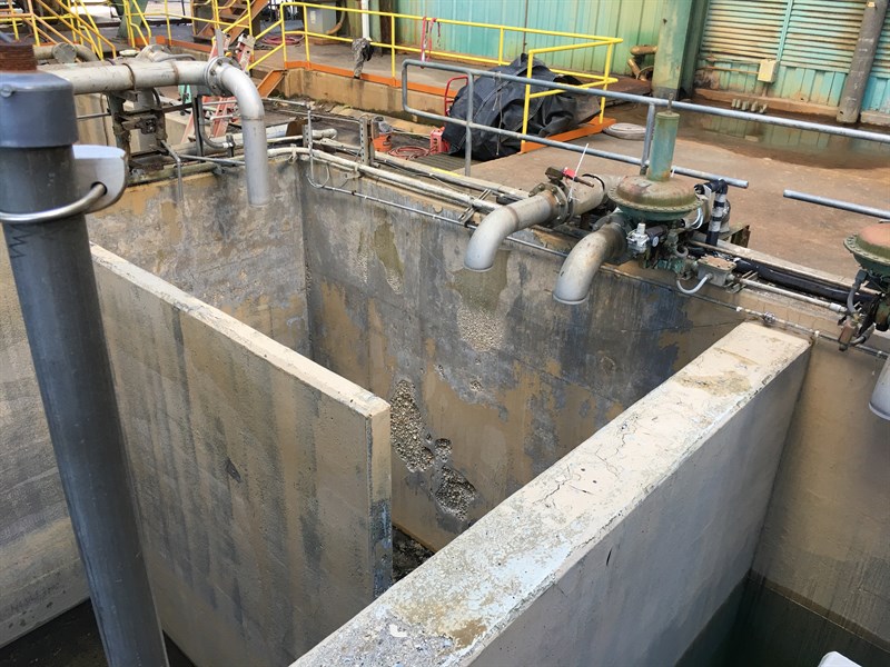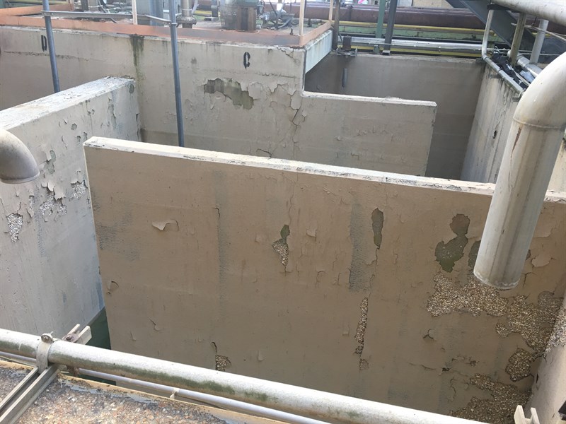Problem: The chemical neutralization of the water that goes back into the river from this coal fired power plant takes place in four concrete neutralization basins. These basins had been coated with Belzona 4111 and over-coated with two coats of Belzona 5811 about 25 years ago. Gradually over the years the chemical attack had eroded some of the product. There was peeling of the walls and some places were down into the concrete substrate.