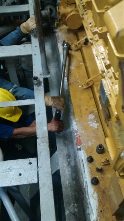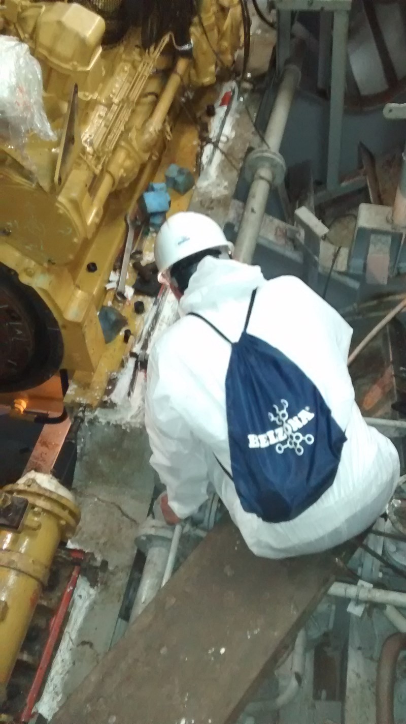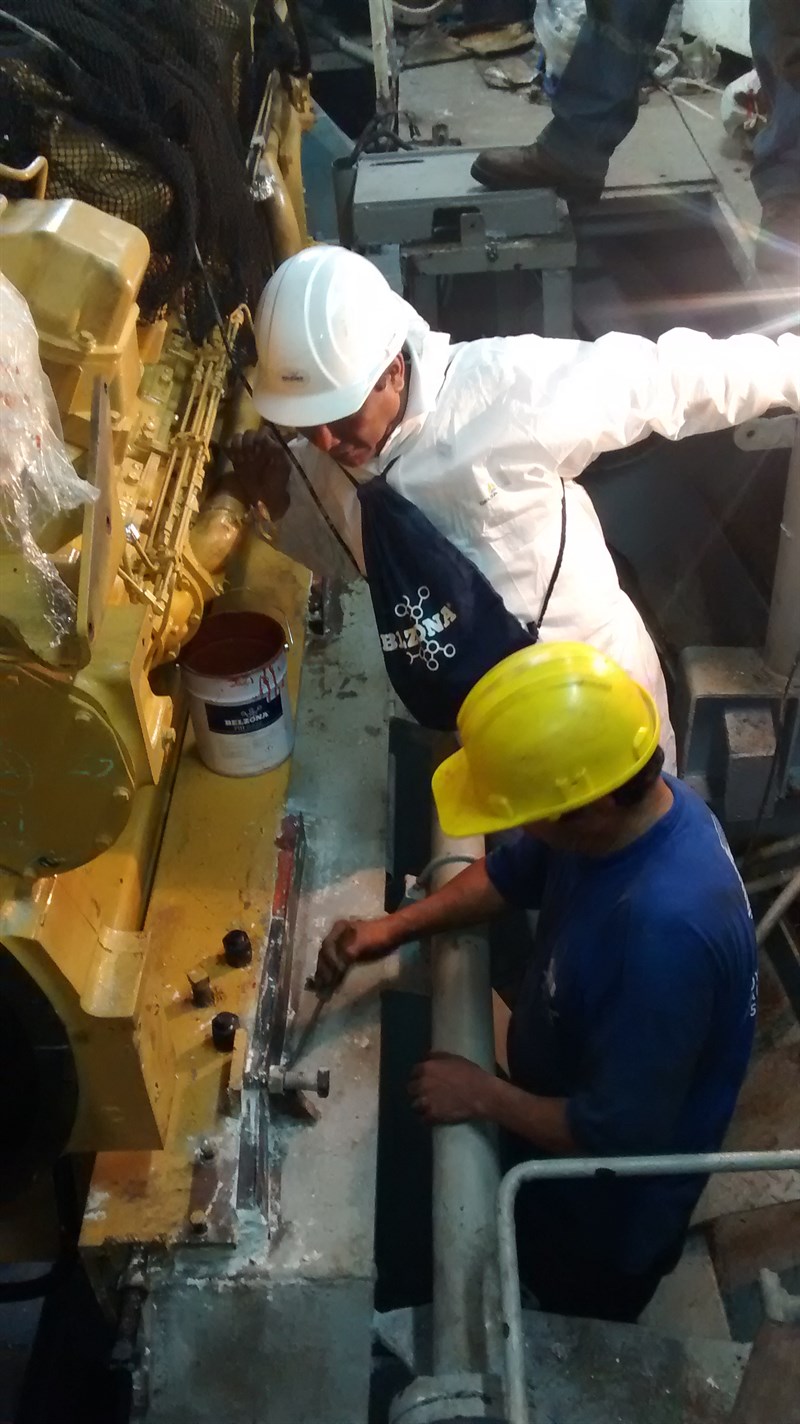 The four chocks for the engine and two for the box were carried out by pouring Belzona 7111 which has American Bureau of Shipping certification. Once the product cured completely, it underwent compression with weight and adjustment of anchor bolts maintaining the specified parameters of alignment. It has been proven that Belzona 7111 has a lower cost than other chocking materials.