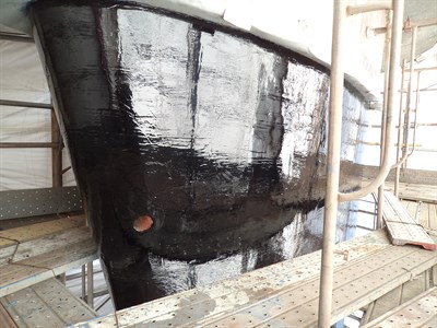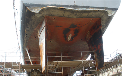 Problem: Due to the shape of the rudders, coupled with disturbed water flowing from the propeller, and the high manouevrability of the vessel, cavitation damage occurs leading to severe erosion corrosion pitting.