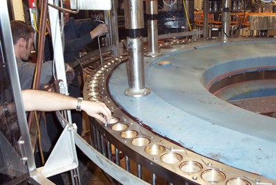 Problem: Corrosion from spills causes the bottle location tooling to loosen. The loose tooling causes more spillage and an ever worsening corrosion.