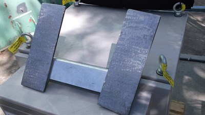 Surface preparation on the plates was done with a grinder and the tank was done with MBX Bristle Blaster. After application, the plates were held in place using 80lb. magnets placed underneath, and 'Gorilla' tape across the top until the Belzona 1111 had cured.