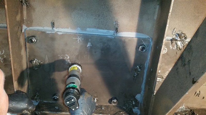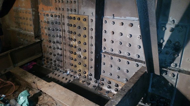 Problem: Water leaking inside the bridge box girder had caused excessive corrosion. Pits, through-wall defects and thin areas were in need of reinforcement. Due to extreme corrosion in the area adjacent and including the splice plates, welding was not an option. Bolting plates and using Belzona to reinforce the irregular surface was the best course of action.
