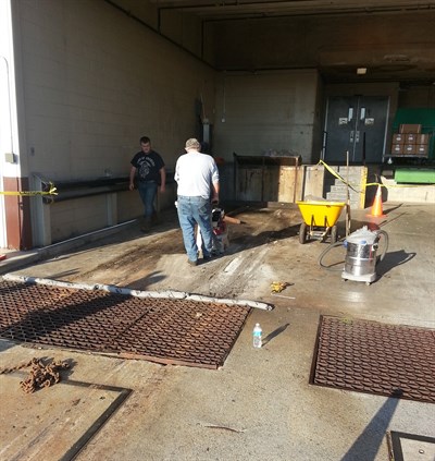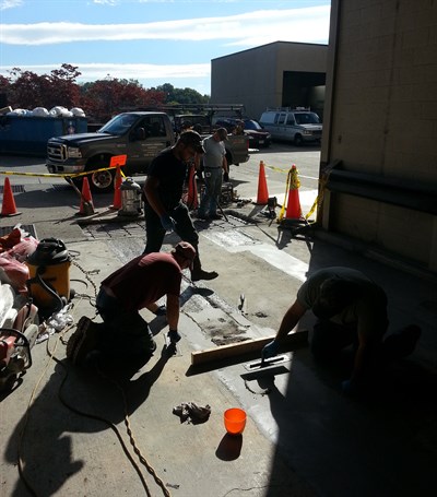 Problem: Concrete in roll-off area was deteriorating due to weight and dragging of trash containers. Large hole was a below ground conduit vault. Rain water was entering the vault area and causing electrical hazards.
