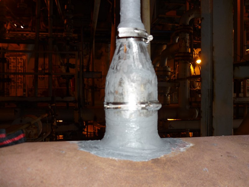 The application was carried out in accordance with Belzona Know-How System Leaflet FBC-6 for sealing leaks. Application was carried out by scaffolding up to the pipe rack. Surface preparation included Bristle Blasting. 1"-3" reducer was suggested by the contractor and split in half beforehand. Hose clamps were used to hold the repair until fully cured.