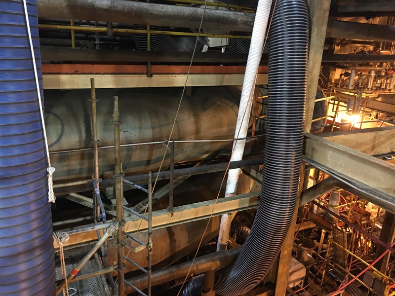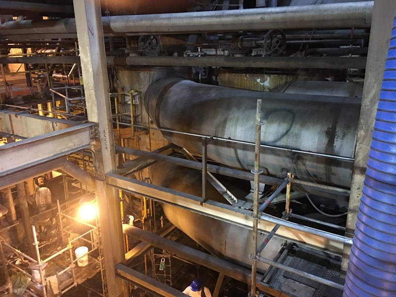 A coal fired power plant large condenser that was located on two levels and extended into two separate rooms.