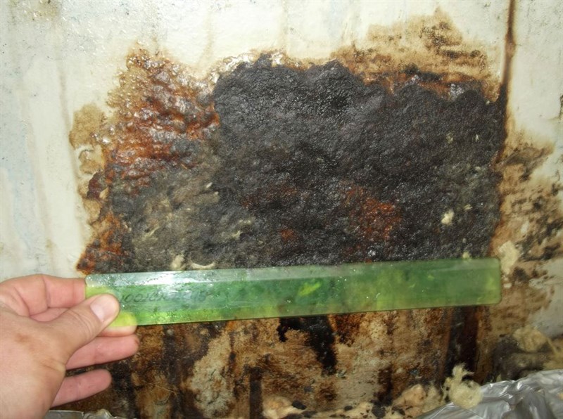 Insulated bulk holding tank containing heavy fuel oil. Corrosion under insulation had led to a through wall penetration at approximately 8m above ground level.