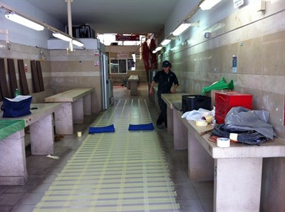 slippery wet floors in fish market operating in touristic city every day from 6am to 2pm.
