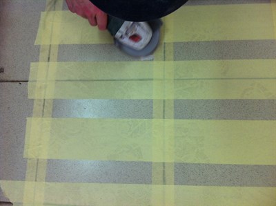 1. Situation in the fish market, positioning of masking tape 2. Surface preparation. 3. Application of Belzona 5231 with additional aggregate incorporated. 4. Application completed - situation after washing the floor