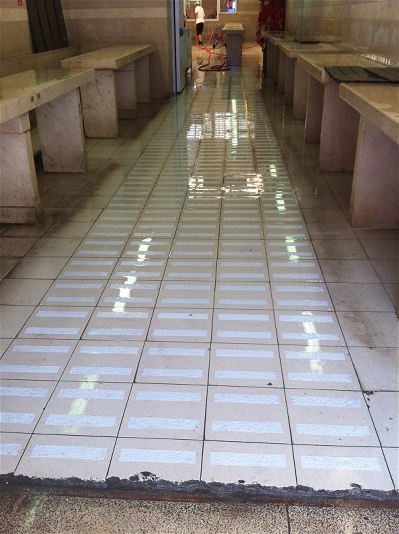 Problem: Existing quarry tiles are wet and sliperry. During summer season there is plenty of people and there was a risk of slipping and injuries. Customer was looking for solution that could solve the slipping problem without the need to close the market.