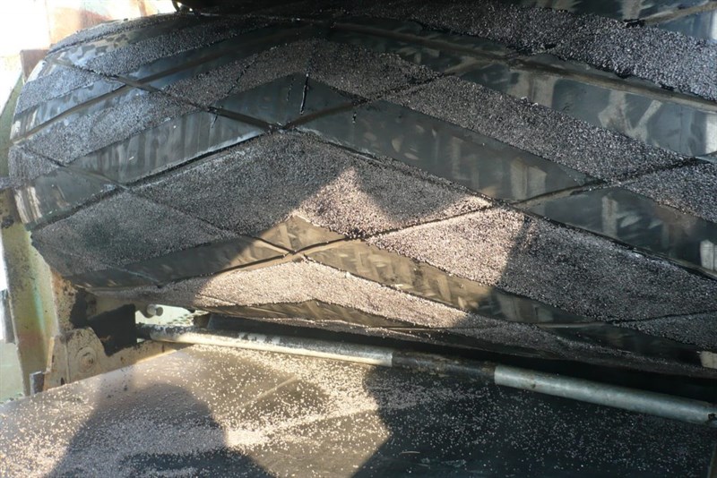 Anti-slip chevron strips were applied directly onto an existing worn rubber lining of a conveyor drive roller. This was done without removing the lining and without dismantling the roller.