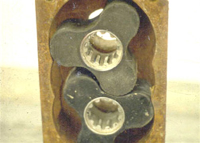Problem: The two intermeshing rubber lobes in the pump rapidly wear and the clearances increase reducing the pumps efficiency. Replacement of the lobes is necessary but expensive and long lead times exist for repalace-ment lobes from the manufacturer.