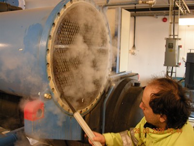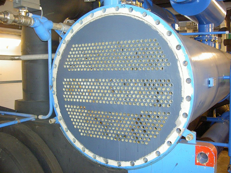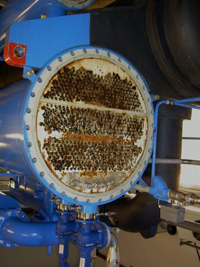 Problem: Corrosion on tubesheets (4) from one of the chillers was noticed in 2005. Cooling water comes from a local lake which together with galvanic effects was the cause of the corrosion.