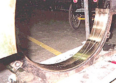 The cost of a new cast iron trunion is approximately $20,000. Replacement of a new trunion was considered, but weeks of procurement time eliminated that possibility because the lime kiln was shut down. The pro-file was restored by using Belzona® 1111 (Super Metal).