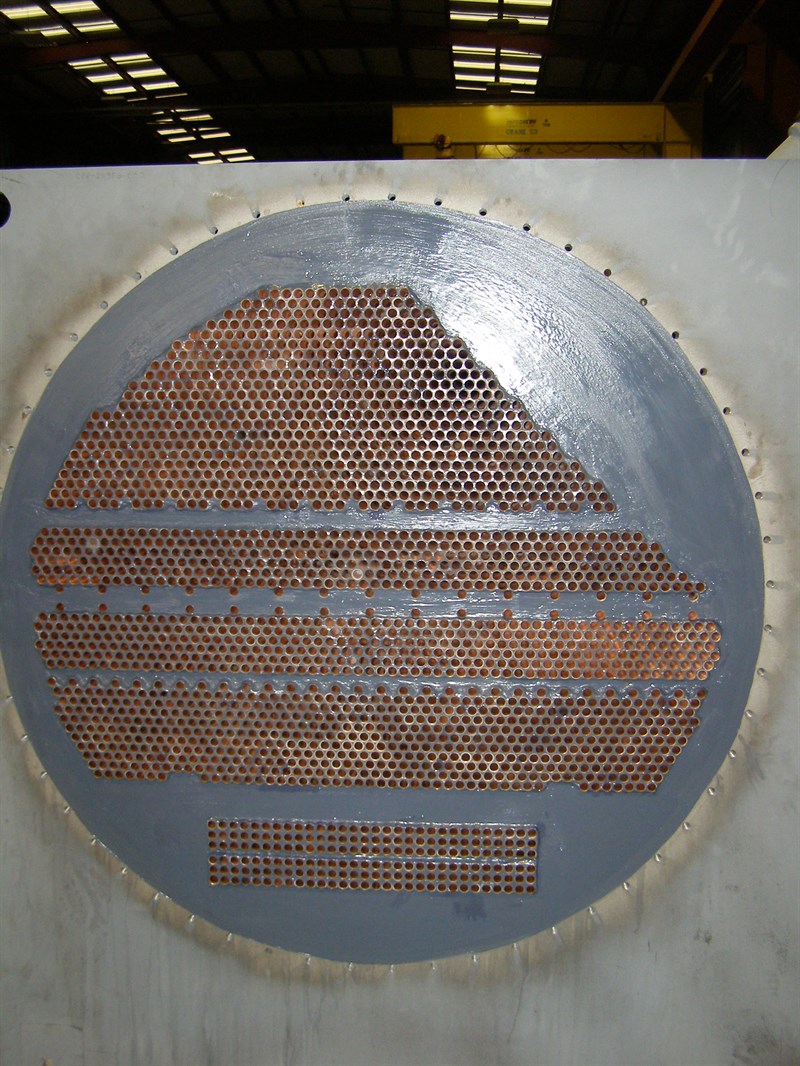 Application carried out in accordance with Belzona Know-How System Leaflets HEX-1 & -3. After corking tubes, Belzona® 1111 used to ensure the tubes are flush with the surface before applying the Belzona® 1321 system.