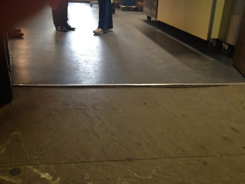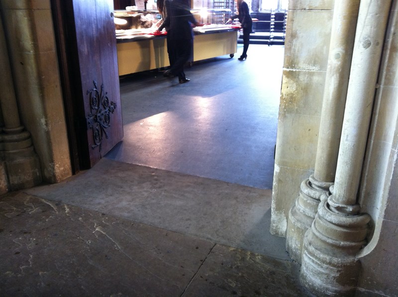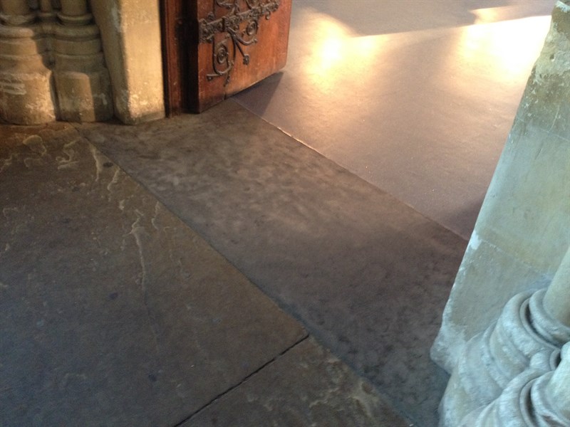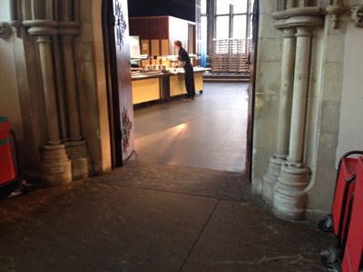 Problem: The stone had worn down over the years creating a lip of about 20mm between the stone floor and the adjoining vinyl floor, creating a trip hazard. They required a repair sympathetic to the stone and which would cause minimal disruption to the canteen operations.