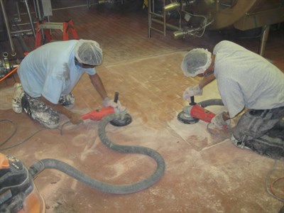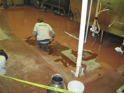 Problem: Existing floor covering badly deteriorated due to regular spills of hot CIP solutions. The dairy is only down from production on Saturday/Sunday.