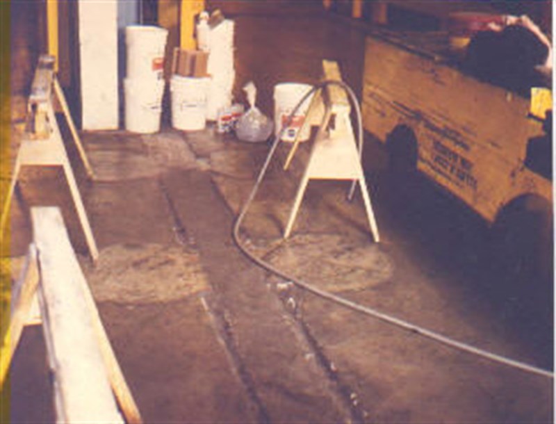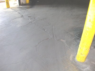 Floor in front of highly trafficed overhead doorway leading to production area. Work had to be carefully scheduled so as not to impede constant traffic flow.