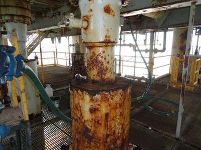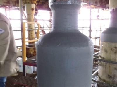 Problem: External/Internal corrosion caused many hole through defects. Conventional welding would have been very time consuming and expensive. Additionally, a hot work repair would have caused shut down of the platform resulting in a great loss of production and income.