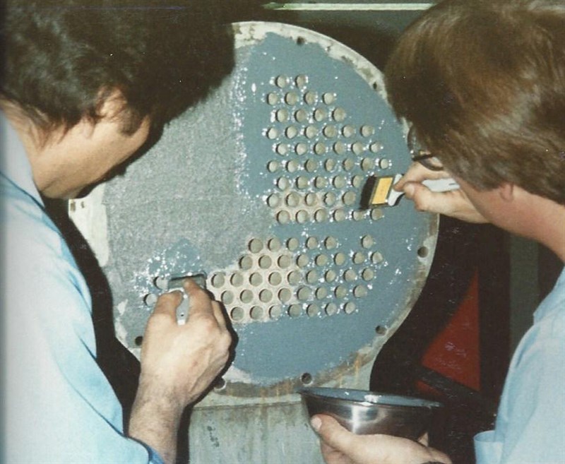 The tube sheet and end cover were blasted and coated with two layers of Belzona 1321. It was decided to not use corks because the tube sheet was small. The application was carried out in accordance with Belzona Know-How System Leaflets HEX-1 & HEX-2.