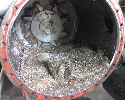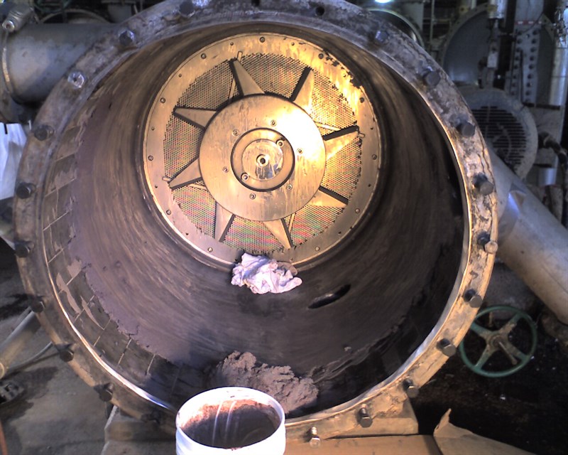 This deflaker is used to spin trash (staples, plastic, glass, metal, etc.) out of recycled cardboard. The inside is lined with basalt tiles. This is a one of a kind machine.