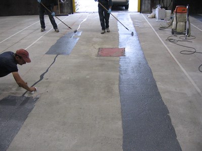 Application was carried out in accordance with Belzona Know-How System Leaflet FPA-3. The concrete was abraded to remove the existing coating and profile the concrete. Areas masked off and Belzona® 5231 Yellow and Gray used for demarcation.