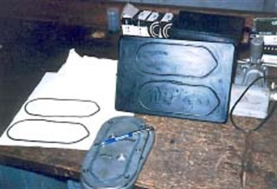 - View of the mold, the plate, and the new gaskets casted from the mold.