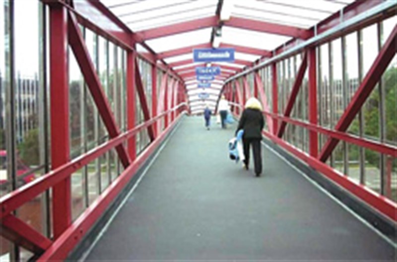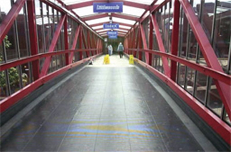 Problem: The enclosed footbridge suffered condensation which made the existing rubber floor covering very slippery.