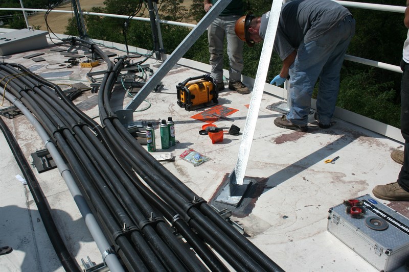 Attaching steel plates to the top of a water tower for the purpose of mounting expensive new cell phone antennas.