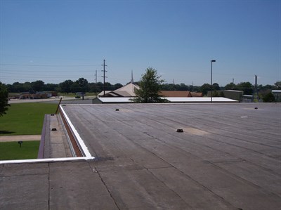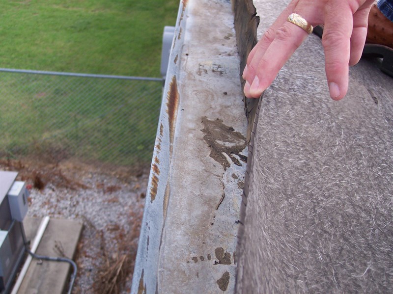 Problem: A small collection trough around the 660' perimeter of the roof had mistakenly been "engineered" into the original installation. Water collected and eventually drained under the roof sheets toward the center of the building until it found a leak path onto the ceiling.