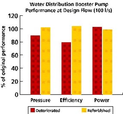 Due to the reduced output of the pump units and the increased demand for water, each unit was removed for inspection and repairs and coating were carried out in line with Belzona P.I.P. recommendations. The pumps were then tested prior to re-installation on-site where dramatic results of all five units were observed. Under normal demand only three pumps are required instead of five. Flow has increased from 65 liters/sec. to 125 liters/sec. at the required pressure. Power consumption was reduced by 5%. Pump efficiency increased by 24%.