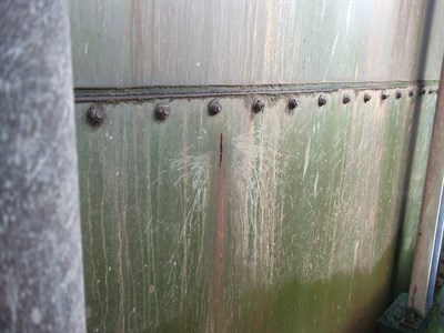 1. Through wall corrosion to primary sludge tank 2. Surface preparation carried out by hand abrasion 3. Repair plate cold bonded over the through wall corrosion using Belzona® 1161 4. Completed application
