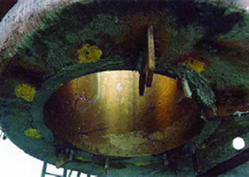 Problem: Corrosion to internal of rudder horn had allowed the press fitted bronze bearing to become free. Bearing was approximately 908-mm (36-inch) diameter and 1050-mm (41-inch) long.