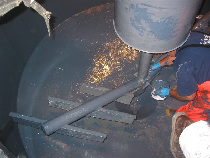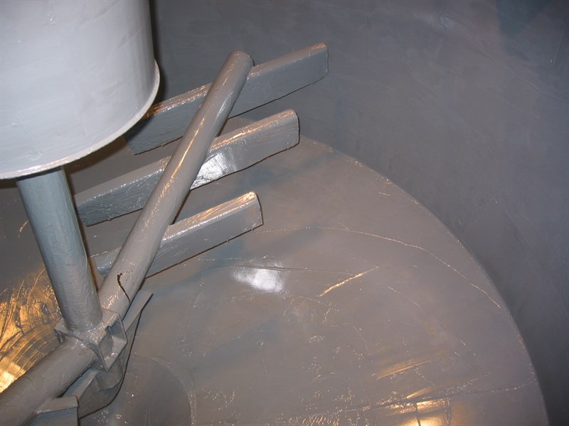 The application was carried out in accordance with Belzona Know-How System Leaflet TCC-3. Two heavy coats of Belzona 1321 were hand troweled and brushed onto all interior surfaces of tank and agitator.