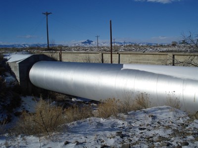 Small hydroelectric plant using water feeding off an irrigation canal. The penstock feeding into the plant is 10 feet diameter and 100 feet long.