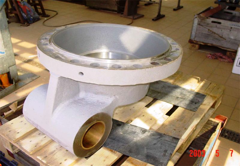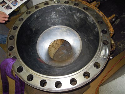 Problem: The nozzle head (hat) is exposed to a very high flow rate with a water pressure of 80 bar and with glacial debris in the water. Protection required to prevent erosion.