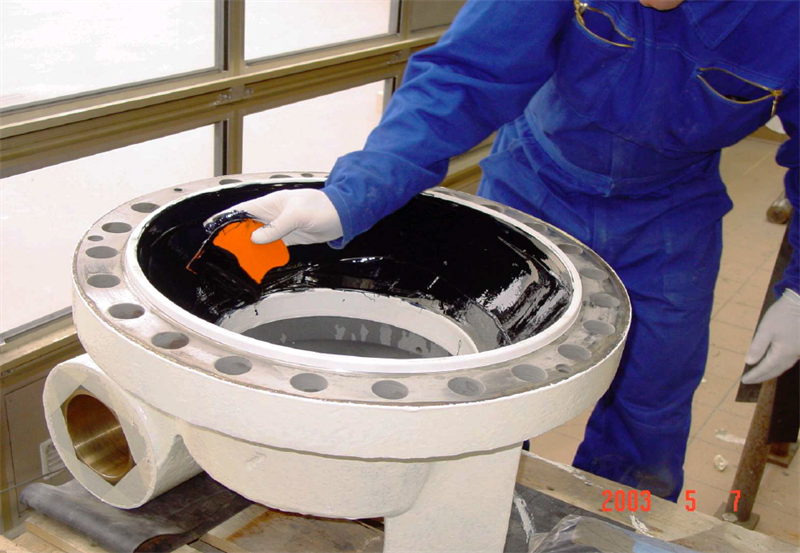 Application was carried out in accordance with Belzona System Leaflet VPF-2. After preparing surface by grit blasting (80 micron profile achieved) Belzona 2141 system was applied at 1mm thickness.