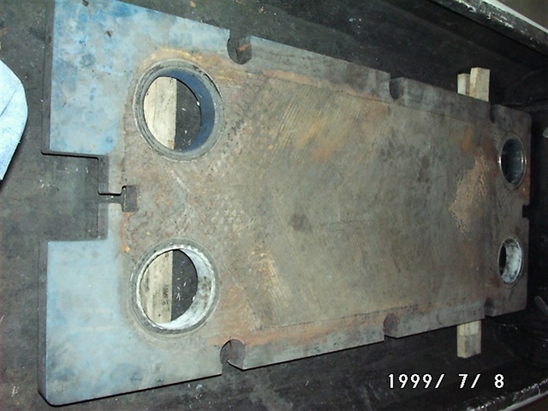 Problem: Galvanic and crevice corrosion to the end covers of the heat exchangers was resulting in leaking around the titanium plates and loss of efficiency.