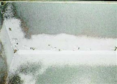 Problem: The debris settles in the 90 degree angles of the weld seams. The 60°C (140°F) environment with a pH 10 leads to galvanic and crevice corrosion of the weld seams.