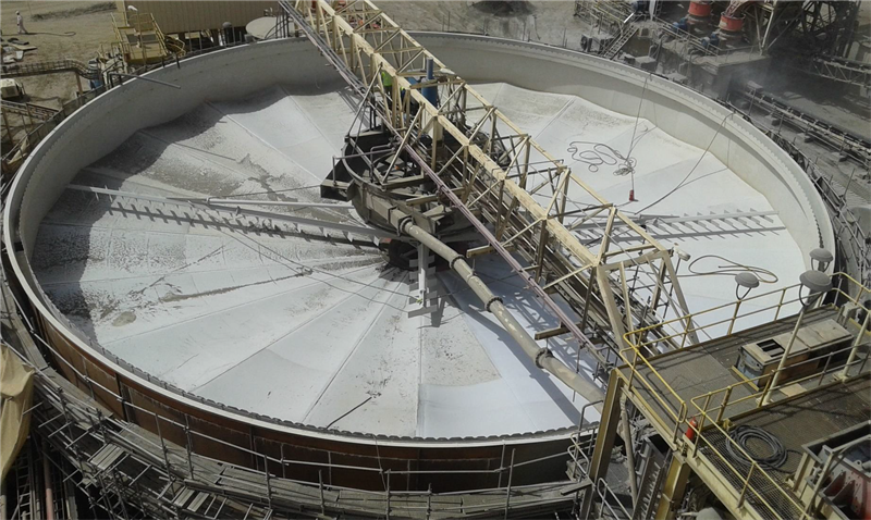 Problem: Both the wall and bottom areas of the thickener were suffering from general corrosion damage. Also, there was a significant presence of erosion on the bottom area up to the height of the rotary arm caused by the slurry.