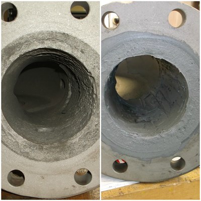 Problem: The pump had a 1/4" hole appear on the outside of the volute, allowing for wastewater to leak during operation. After opening the pump, it was discovered that there was fairly extensive damage in four locations as well as damage to the cutwater and erosion in the throat and on the flange face.