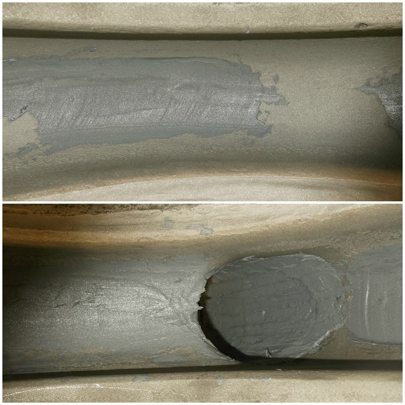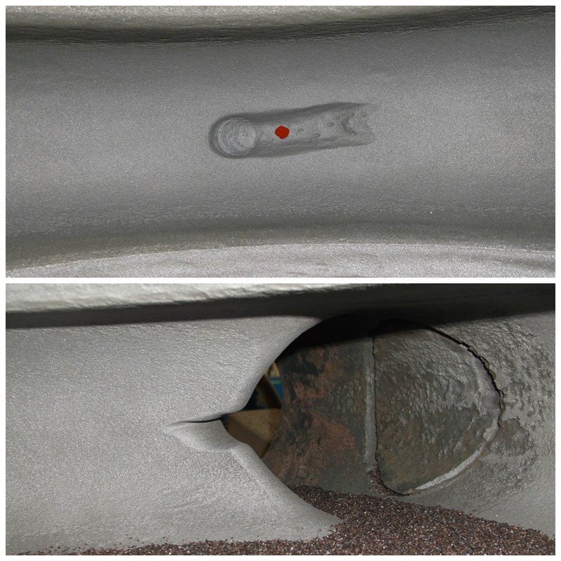 - Top: Hole in volute repaired / Bottom: Damage to cutwater repaired with 1111.