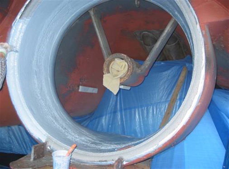 - Application of first coat of Belzona® 1341 with application of Belzona® 1311 to fill the voids and depressions in progress.